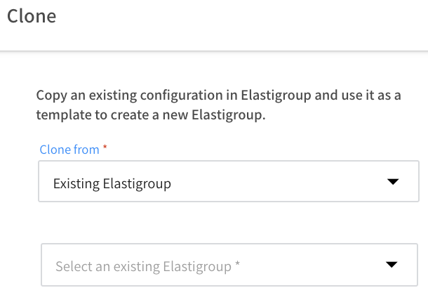 You can create a new Elastigroup in Spot by cloning an existing Elastigroup. The new group will have the same configuration as the existing group. The clone feature provides a convenient way to replicate the configuration of an existing group or, alternatively, to use the configuration as a template for creating a new group and modifying it to suit your needs.